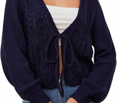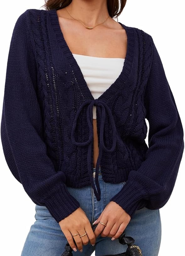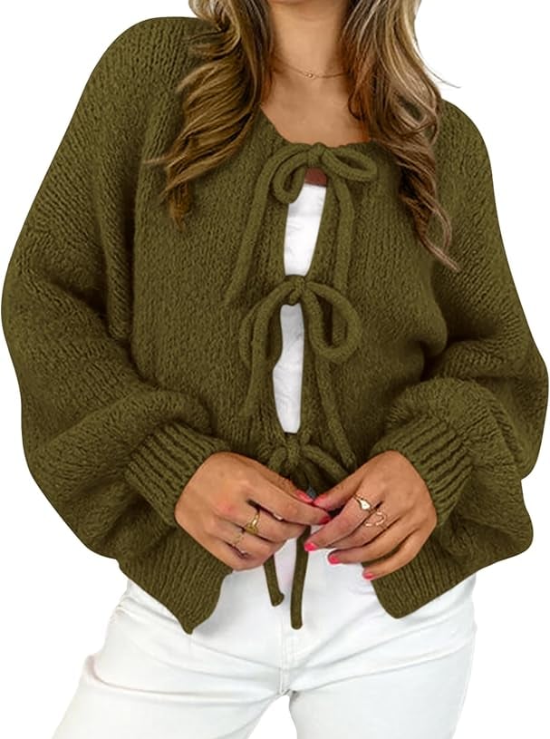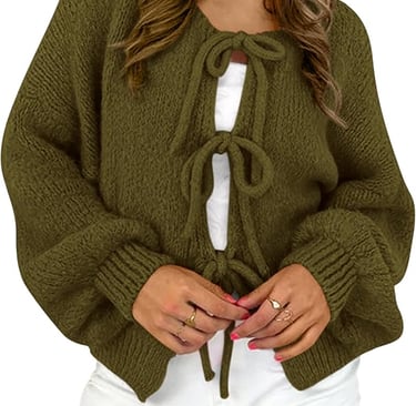 Cozy and chic, this olive green knit sweater features cute tie-front details and balloon sleeves for a stylish, relaxed fit.